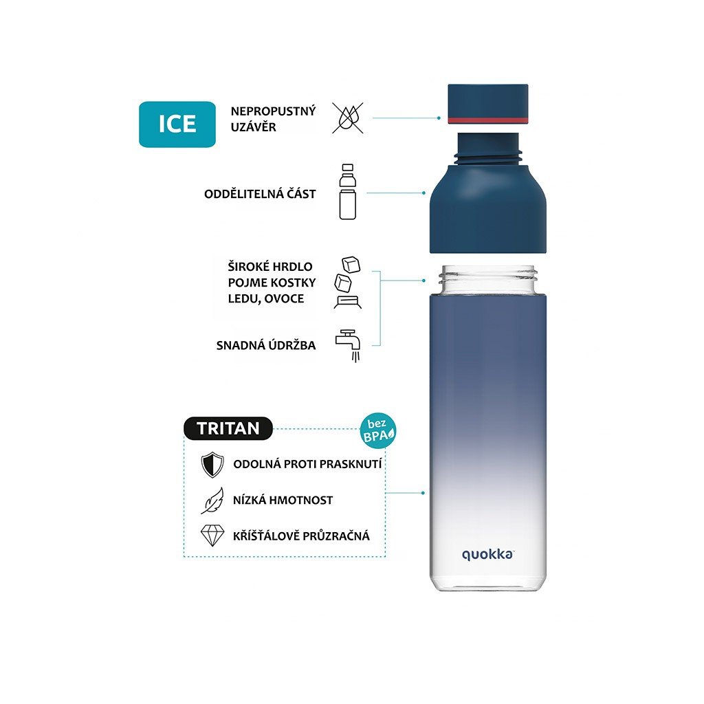 Detská fľaša Quokka Ice Kids s dvojitým otváraním umožňuje vloženie kociek ľadu či kúskov ovocia a zároveň sa ľahko čistí. 100% tesniace, skrutkovacie uzávery chránia obsah fľaše pred vyliatím. Pútko uľahčuje prenášanie a zároveň chráni uzáver pred stratením.