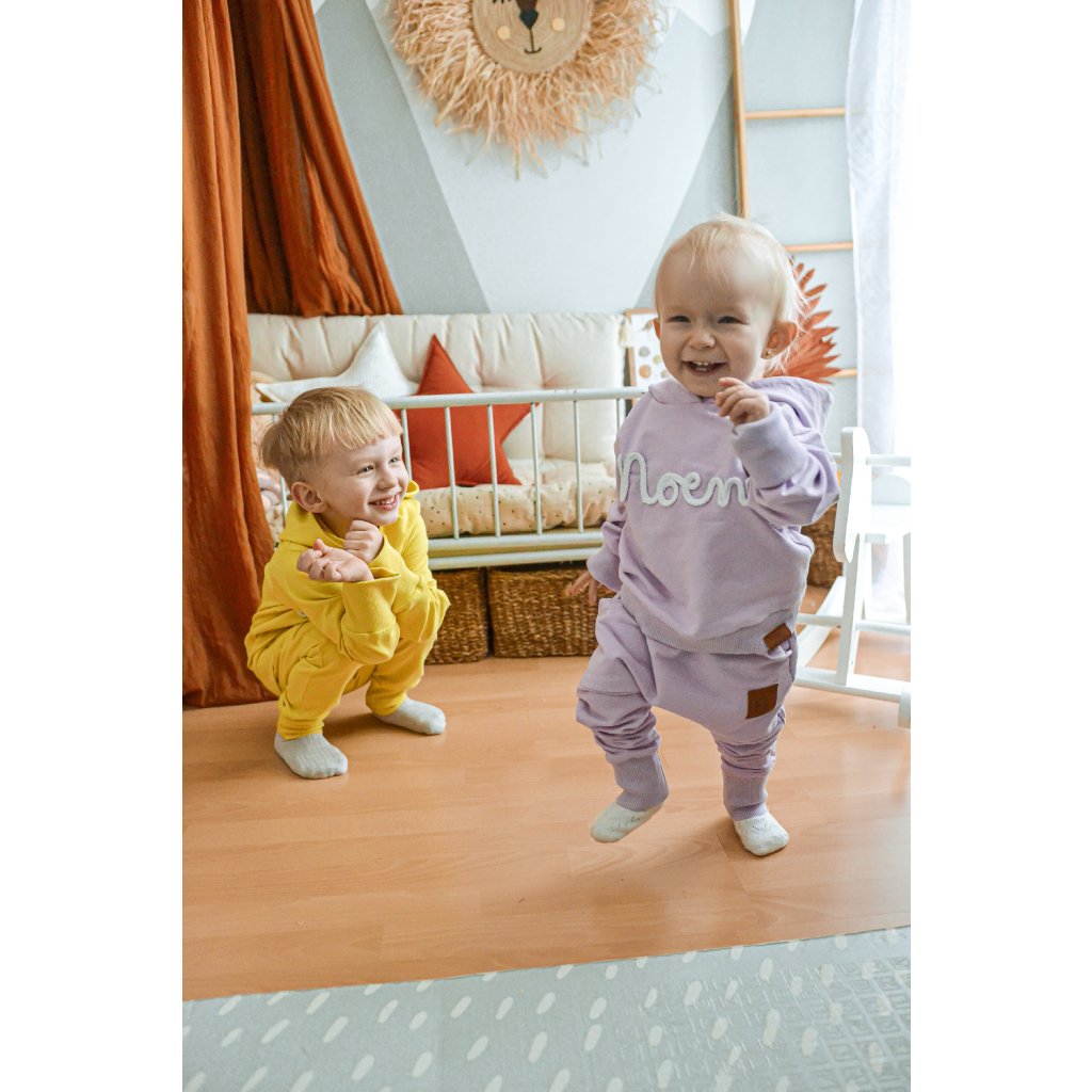 Tepláky z certifikovanej teplákoviny bezpečnej pre deti s rastúcim patentom, vďaka ktorému získate 2 veľkosti v jednom. Na prednej strane praktické klokanie vrecko na všetky poklady.